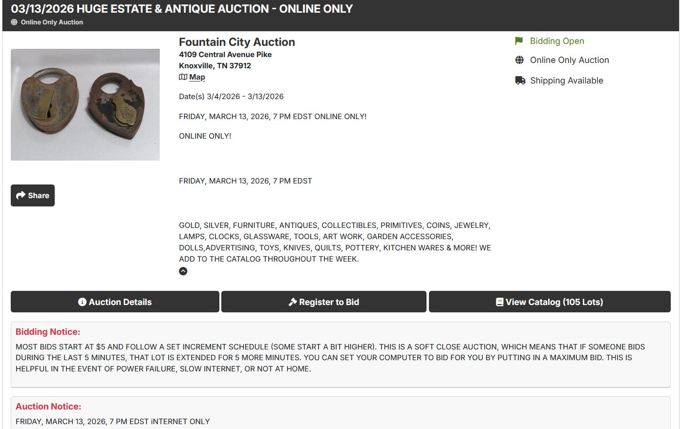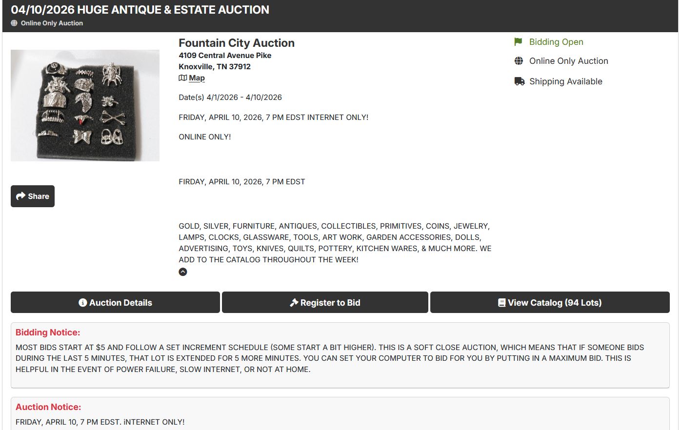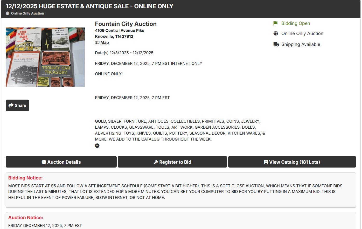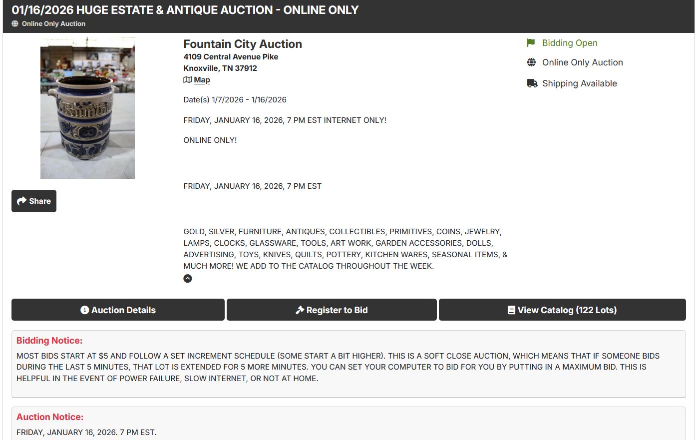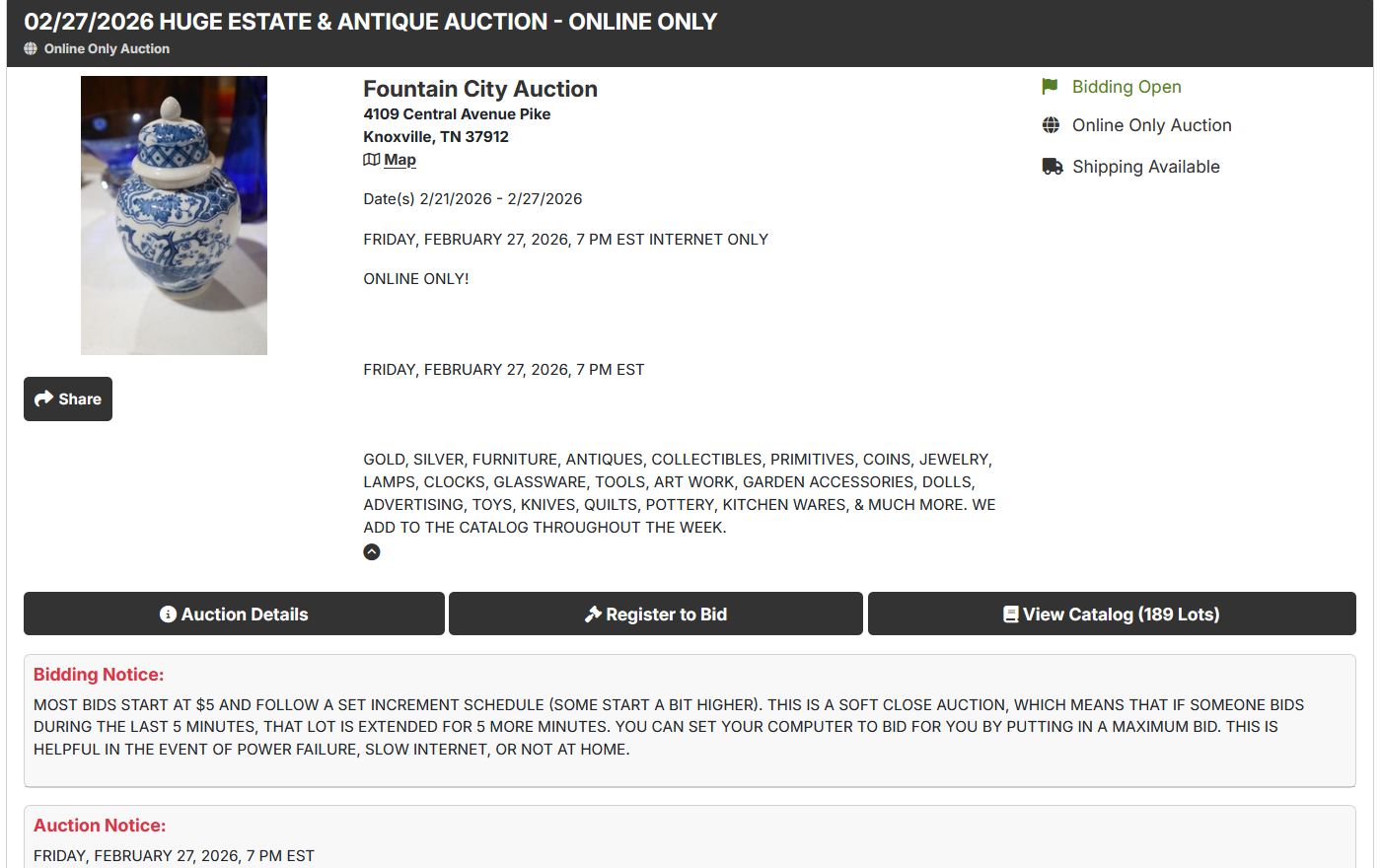Internet only. 1st lot starts coming down at 7:00 pm est, Friday’s and 2:00 pm est. for Saturday sales. Lots come down in 30 second increments unless someone bids in the last 5 minutes; then that lot is extended for 5 more minutes.